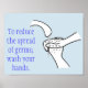 These posters feature an illustration of soapy hands under a faucet of running water. To the left of the drawing is the text - To reduce the spread of germs; wash your hands. The background color of light blue can be customized to a color of your selection. Thank you for shopping CherylsArt on Zazzle.