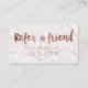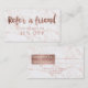 Refer a friend with this modern, stylish makeup referral card with modern hand lettering style brush typography in faux rose gold foil on a trendy and elegant customizable pink marble background.