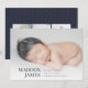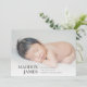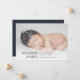 Modern minimal birth announcement card features a horizontal or landscape oriented photo with baby's name, birth stats, and a family signature aligned at the bottom in elegant, classic lettering. Add three additional square photos to the back.