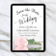 This wedding Save the Date card is romantic, elegant, classy, and beautiful. It features a photograph of a single long stemmed blush pink colored rose reflecting in a pool of water with waves and ripples. The text is a fancy script calligraphy on a white background. The back features a lovely marbled pattern. Perfect way to let your friends and family know about your upcoming wedding.