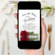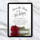 This wedding Save the Date card is romantic, elegant, classy, and beautiful. It features a photograph of a single long stemmed red rose reflecting in a pool of water with waves and ripples. The text is a fancy script calligraphy on a white background. The back features a deep red or burgundy plush pattern. Perfect way to let your friends and family know about your upcoming wedding.
