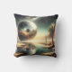 This weathered, surreal metallic sphere reflects an apocalyptic, baron desert landscape, with dead trees, fire and smoke.