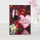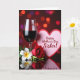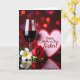 This card shows a romantic still life arranged on a glossy, dark tabletop, where reflections double the scene like a quiet echo of closeness. On the left stands a tall, slender stemmed glass filled with deep crimson liquid, its curved surface catching small highlights as if it’s leaning in toward the rest of the display. Beside it sits a soft pink, heart-shaped plaque edged in red, and the message text is centered on the heart in a darker tone that stands out clearly. In the foreground, a velvety red rose rests diagonally, its tightly layered petals suggesting a tender, just-given gesture ❤️. Near the rose, a white tropical flower opens wide to show a pale yellow center, with green leaves and a few closed buds tucked around it like quiet companions 🌼. The background fades into soft, out-of-focus circles of light in warm reds, amber, and a touch of violet, giving the setting an intimate, candlelit feel without showing any people. The dark surface below mirrors the glass, heart plaque, and flowers with a smooth, slightly blurred reflection.