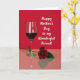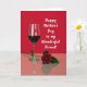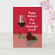 This card features a rich range of reds that sets a cozy, celebratory mood ❤️. In the center, a tall, slender glass sits on a glossy surface, half-filled with deep red liquid that glows softly under the light. Bright vertical highlights run down the clear glass, and its shape is echoed in a gentle reflection below, like a quiet moment shared between two close hearts. Beside it, a single red rose rests at an angle, its layered petals open as if leaning in with affectionate ease. A few dark green leaves and the stem add a natural contrast, and the rose also appears in the softened reflection, reinforcing the intimate, paired look of the arrangement. Across the solid crimson background, a flowing white message is placed prominently, standing out clearly above the still life 🌼. The scene is lit with smooth, diffused light, and the glass and rose both cast a faint mirror image on the shiny red surface.