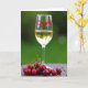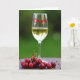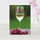 This greeting card shows a clear, stemmed glass set front and center, filled with amber-gold liquid that catches tiny highlights like a cool drink on a relaxed afternoon. Across the bowl of the glass, bright red cursive-style lettering stretches horizontally, giving the scene a flirty, toasting-together feel ❤️. Below, on a warm brown tabletop with a faint texture, a small pile of glossy red cherries rests close together, as if gathered for sharing. Their thin green-brown stems crisscross and curl, adding a gentle, intertwined look that hints at closeness between two people leaning in. Behind everything, a soft, blurry wash of leafy green suggests an outdoor garden or patio, keeping attention on the glass and fruit. The lighting is natural and diffused, with soft reflections on the glass and tiny points of shine on the cherry skins 🌼. The red lettering sits across the midsection of the glass, while the cherries cluster along the lower edge against the warm brown surface.