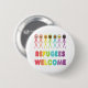 Refugees Welcome design features a diverse collection of stick people in a friendly welcoming group. The wording and colors celebrate diversity, new arrivals and aims to ensure refugees and migrants are made to feel welcome.