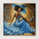 A captivating woman exudes regal elegance, adorned in a dazzling azure blue gown with intricate silver embellishments and a matching wide-brimmed hat. She poses gracefully against an opulent golden background, shimmering with celestial light and intricate floral motifs, creating a scene of luxurious fantasy.
