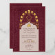Embrace the essence of heritage and elegance with this regal burgundy wedding invitation, intricately designed with lace patterns that take inspiration from traditional Islamic art. The front displays a stunning latticework centered around a pointed arch, a hallmark of Islamic architecture, bordered by a detailed floral motif in rich burgundy tones. This contrasts beautifully with the off-white space where the event details come to life in an elegant script. The reverse side complements the front, continuing the exquisite lace pattern, and offering space for additional text or blessings. This invitation, perfect for a culturally rich and sophisticated wedding, celebrates the fusion of ancient artistry with contemporary design.