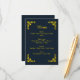 Elevate your Islamic wedding celebration with the Regal Contrast wedding menu card, featuring a luxurious midnight blue background and gold floral corner accents. Ideal for Nikah or Waleema events, this elegant card lists starters, main courses, desserts, and beverages in a stylish, easy-to-read format. Designed to coordinate perfectly with the Regal Contrast invitations and RSVP cards, it adds a sophisticated and cohesive touch to your wedding dining experience.