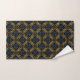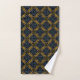 An African inspired geometric pattern towel set in golden yellow with blue on black to add a cool tribal element to any bathroom.