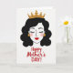 Designed with a serene, regal woman centered on a white background, this card focuses on her softly drawn face with eyes closed and long lashes, as if she’s savoring a quiet, affectionate moment ❤️. Her wavy black hair frames her pale skin, and a light rosy blush on her cheeks adds a gentle warmth that feels like a tender hug. A detailed gold crown with delicate cutout patterns rests on her head, giving the portrait a graceful, honored look. Matching gold earrings shaped like small roses bring in a romantic touch, like a subtle nod to someone cherished 🌼. Beneath the portrait, the message “Happy Mother’s DAY!” sits near the bottom, written in flowing red lettering that stands out clearly against the white space. The layout keeps lots of open space around the figure, letting the black hair, gold accents, and red words feel balanced and easy to notice. The crown’s gold lines show tiny curls and leaf-like shapes, and the rose earrings hang just below her jawline.