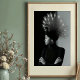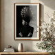Command attention with this stunning black and white art print, a true masterpiece of avant-garde fashion and artistic expression. This striking profile portrait features a woman of poised elegance, crowned with an extraordinary, sculptural headpiece shaped like a majestic peacock, its fanned feathers radiating a soft, luminous glow. Dressed in a sleek black turtleneck and adorned with a detailed stud earring, her minimalist attire provides a sophisticated canvas for the dramatic headwear. Rendered in high-contrast monochrome against a captivating backdrop that transitions from deep black to soft grey, this artwork emphasizes form, texture, and the powerful presence of the subject. Perfect for modern living spaces, fashion studios, or any decor seeking a touch of unique elegance, bold artistry, and a truly unforgettable visual narrative.