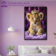 A charming and whimsical portrait of a young lion cub wearing a delicate golden crown, set against a rich purple backdrop. This artwork blends regal symbolism with playful warmth, creating a striking yet endearing piece that brings character and imagination to any space.