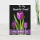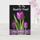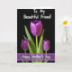 Designed with three deep violet flower buds at the center, the tallest bloom stands slightly forward while two smaller ones lean in close, like friends sharing a quiet moment ❤️. Slender green stems and glossy leaves gather beneath them, adding a fresh contrast against the velvety black background. Light falls across the petals to reveal fine ridges and soft curves, giving the blossoms a gentle, almost touchable look. The wide dark space around the flowers feels like a stage, drawing your eye to the intimate cluster and their calm, affectionate closeness 🌼. Near the top, the phrase “To My Beautiful Friend!” appears in small white lettering, centered above the blooms. Near the bottom, “Happy Mother’s Day” sits in white text inside a pale lavender band that stretches across the card. The lavender band is slightly see-through, with soft edges that float over the black backdrop just below the leaves.