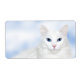Long haired, possibly Turkish Angora, blue eyed white cat photo label