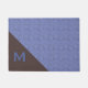 Stylish regency blue door mat, with a metal looking decorative circle pattern. The bottom left corner is done in solid brown, with a regency blue single letter monogram ready to personalize.
