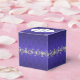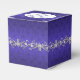 Elegant wedding favor box done in a regency blue damask background. The top of the box has a decorative silvery gray and white text plaque, with regency blue custom text ready to personalize. Lovely digital graphics of a silver tone floral jewel like garland, runs around the middle of the box. Lovely little gift box for candies and anything else you want to give your guests.