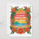 Colorful reggae party invitation with an island sunset surrounded by tropical flowers