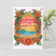 Colorful reggae party invitation with an island sunset surrounded by tropical flowers