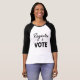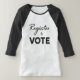 Encourage people to "Register to VOTE" with a white t-shirt with 3/4 black sleeves featuring the words "Register to" in script and "VOTE" in a bold font for a stylish typography design in black text. You can choose other styles and colors of shirts in the sidebar.