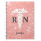 Registered Nurse Caduceus Pink Personalized notebook is a modern stylish design with rose gold blush pink and white speckled background and a white medical symbol on the center. The text is "RN" and your name is personalized with in trendy script lettering. Great for registered nurses and nursing students.