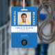Modern typography hospital employee RN custom personalized blue ID badge with bold typography, barcode, and custom logo. +++++++++++ Easy to personalize with your photo and details on both sides.
