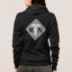 This nurse's jacket hoodie is designed with a white caduceus symbol and "RN" on the back center of silver faux glitter diamond shaped border. A smaller matching design is on the front upper left area. It is available in different colors and styles.