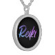 *Round necklace with a black background with the word "Reiki" in a gradient iridescent neon design.*