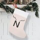 Simpe, Stylish Christmas Reindeer Antler custom Initial stocking with two silhouette deer antlers in black over a single letter in modern minimalist typography on a pale cute baby pink background. The letter can easily be personalized with the initial of your loved one as the perfect festive gift.