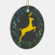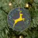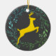 Yellow Blitzen the reindeer in the night sky surrounded by a wreath of blue and green.