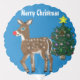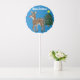Festive Reindeer Christmas holiday balloons. Cartoon character Super Snow the Blue-eyed Reindeer is a cute button buck with white spots on brown fur and big red nose with blue highlights on his nose. He's standing ready for Christmas next to a decorated old-fashioned Christmas tree in brown burlap bag with gingerbread man, candy canes, ornaments, and yellow star on top. Original Artwork © 2013, 2016 TamiraZDesigns.