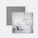 A magnet with a watercolor image featuring a black silhouette reindeer standing among some pine trees. Gray black and white neutral color scheme.