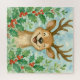A watercolor illustration of a joyful reindeer amidst a winter wonderland of holly and mistletoe