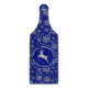 This Holiday cutting board features a silver faux glitter snowflake pattern on a dark blue background. The matching dark blue center has a reindeer in the center of curved text that says Merry Christmas and Happy New Year. Festive for the Christmas season! *Please note - the image is printed and does not contain glitter.*