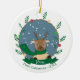 Here is a cute first Christmas ornament featuring a reindeer wearing a green scarf and a yellow sweater . Personalize it with the name of your baby and the year .