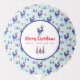 A festive Merry Christmas balloon with a repeating pattern. Illustrated with a pair of blue scandinavian deer wearing red scarves. With decorative markings on their bodies. As well as a trio of red and blue christmas trees with a star on top. Fancy snowflakes sprinkled around.