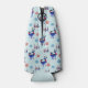 A bottle cooler with a repeating pattern. Illustrated with a pair of blue scandinavian deer wearing red scarves. With decorative markings on their bodies. As well as a trio of red and blue christmas trees with a star on top. Fancy snowflakes sprinkled around.