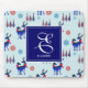 A mousepad with a repeating pattern. Illustrated with a pair of blue scandinavian deer wearing red scarves. With decorative markings on their bodies. As well as a trio of red and blue christmas trees with a star on top. Fancy snowflakes sprinkled around. A square layered over top with a personalized monogram initial and name inside.