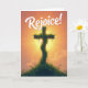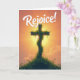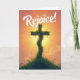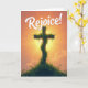 This design shows a tall, rustic wooden cross centered in the scene, rising from a bed of deep green leaves as warm golden light pours around it. Behind it, the sky shifts from soft peach near the edges to a rich orange glow closer to the middle, like sunrise or sunset. Green vines wrap and trail across the wood, adding a gentle, living touch that feels like a quiet promise of renewal 🌷. The brightest light flares from behind the crossing point of the beams, forming a sunburst that outlines the shape with a glowing rim. The wood grain looks weathered and textured, while the leaves and vines appear fresh and glossy, creating a tender contrast between age and new growth 🐰. Near the top, the word “Rejoice!” sits in white cursive lettering, spaced clearly against the open sky. The upper background stays uncluttered so the text is easy to read, while the lower area is fuller with layered foliage in several green tones. The sunburst rays spread outward from the center, fading into the orange sky around the cross.