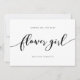 Stylish Will You Be My Flower Girl card featuring the words "flower" in a relax cursive script in black against a white background. Card has a black back side featuring overlapping white lines.