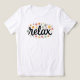 A soft, uplifting design featuring the word “relax” in flowing, hand-lettered typography. The design also includes daisy-like flowers in shades of yellow, pink, green, and orange, with fresh green leaves adding a light, natural touch. The overall style feels bright, hopeful, and playful—perfect for everyday wear and spreading positive vibes.
