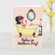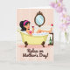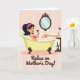 Designed with a relaxed, romantic mood, the illustration features a woman with glossy dark hair and a bright pink headband, reclining in a cream clawfoot bathtub with dark, sculpted feet. She wears a gentle smile as she lifts a ruby-red drink in a stemmed glass, giving the scene a quiet “to you and me” kind of intimacy ❤️. The tub is piled high with frothy bubbles, and the soft lighting makes the bathroom feel cozy and private. Behind her, a blush wall with subtle stripes adds warmth, while a dark oval mirror in an ornate frame hangs above the tub and catches a faint gleam. A slim wooden side table sits nearby, holding a tall green bottle and a tight bunch of deep red flowers 🌼. The main message text is placed near the top in flowing dark lettering, with smaller accent text tucked below in a lighter tone. The final details include the creamy tub rim, the glossy bubbles, and the crimson blossoms standing out against the pink-striped wall.
