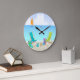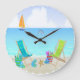 This Relaxing Beach Wall Clock features a beach background with ocean, sand, sailboat and dolphin, two colorful beach chairs with beach bags, beach hats, flip flops starfish. Perfect for any room in your home, beach house or office. Also makes a wonderful housewarming gift! Matching items include; pillows, dinner & cocktail napkins, place mats, kitchen towels, tiles/trivets, coaster set, mugs, pitcher, teapot and candy jars are also available in our shop.