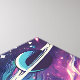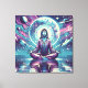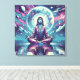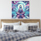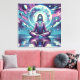 A beautiful serene relaxing ai illustration of a blue and purple scene with a woman medicating in front of the moon, planets, stars and galaxy to give you a peaceful vibe. Pretty for a meditation room or a yoga studio.