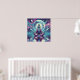 Medication poster. A beautiful serene relaxing ai illustration of a blue and purple scene with a woman medicating in front of the moon, planets, stars and galaxy to give you a peaceful vibe. Pretty for a meditation room or a yoga studio.