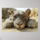 Funny selfie-like close up portrait of a lion comfortably laying facedown on the ground of a desert landscape