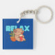 This adorable keychain features a cartoon capybara sitting in an orange pot next to a green plant. The capybara is holding a red book and appears content, with the word “RELAX” above it in bold, light blue letters. This keychain is perfect for capybara lovers and those who enjoy a relaxed, bookish vibe. Made from high-quality materials, it’s a delightful and durable accessory for your keys, bag, or backpack.