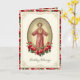 Featuring a beautiful Catholic vintage image of the Sacred Heart of Jesus with a border of red roses. Inside is a scripture verse and greeting.