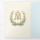 This is a beautiful traditional Catholic religious customized image of the Blessed Virgin Mary, Our Lady of Grace with blue flowers. The front includes an image of Mary overlaid on a Marian "M". All text and fonts may be modified to suit the occasion and recipient. The traditional Catholic Memorare Prayer is detachable.