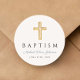 Personalized Religious Cross Dusty Blue Script Boy Baptism Classic Round Sticker.